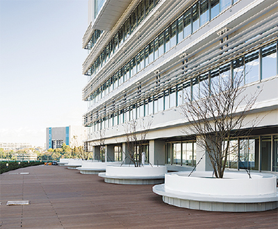 藤沢市新庁舎は、保険年金課や介護保険課、子育て給付課など利用者の多い窓口エリアを1階から4階に集約し、個別の相談室・面談室も設けた。また、市民が気軽に来庁できるよう、コンビニやラウンジ、子どもの一時預かり所も併設。イベントを行うことができるサークルプラザや屋上庭園、富士山や海が一望できる展望デッキも設置される。