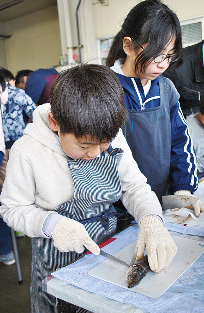 当日は親子連れ約30組が参加。地元の漁師らが講師となり、魚のさばき方を指南した。子どもたちは「緊張する」と話しながら包丁を使って、鯵の頭と内臓をとり、3枚におろした。