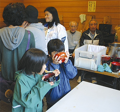当日は雨の中、約70人が集まり、「山崎・谷戸の会」が同公園内の田畑で収穫した食材を使用したおにぎりやきな粉もち、「谷戸鍋」と呼ばれる野菜たっぷりの味噌汁などを口にし、鎌倉の秋の味覚を楽しんだ。