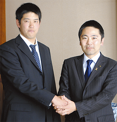 鎌倉市出身の横浜DeNAベイスターズの加賀美希昇投手(23)が、先月27日に松尾崇市長を表敬訪問した。