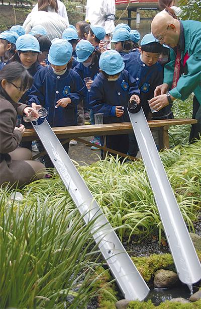 6月の「蛍放生祭」で美しい光を放つことを期待し、今月12日、鶴岡八幡宮の柳原神池で幼稚園児らにより蛍の幼虫放流が行われた=写真。参加したのは鶴岡幼稚園の園児約50人。今回、源氏蛍の幼虫3千匹と、その餌となるカワニナ1万5千匹が神池に放たれた。
