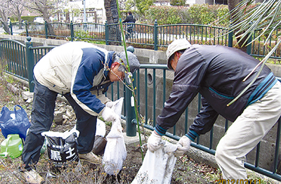 お花見や飲食を楽しむことができる「砂押川沿い・さくら祭り」が4月1日(日)、岩瀬こい公園(市内岩瀬)で行われる。午前10時30分から午後2時まで。雨天時は4月8日(日)に延期される。祭りを控えた今月11日には「砂押川プロムナード桜愛護会(齊木昭嘉代表)」と「玉縄桜をひろめる会(吉田充夫代表)」により、玉縄桜の苗木3本が砂押川沿いに植樹された。