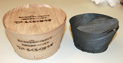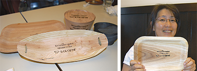 食器には大分県の植林地の間伐材を使用。2㎜ほどの厚さの板に圧力をかけるだけの簡単な加工が施されている。使い捨てで、使用後は同団体で回収、炭化させて脱臭剤や森林の土壌改良剤などとして活用される。