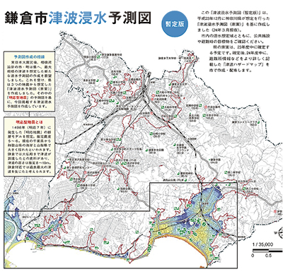 鎌倉市は津波ハザードマップにあたる「鎌倉市津波浸水予測図」の「正式版」を3月中に発行する。昨年3月に発表された「暫定版」を県が出した最大津波高14・5mという予測を踏まえて改訂したもので、被害水域やこの1年で新たに指定した津波避難ビルの場所などが掲載されている。市総合防災課は「これをもとに、避難場所や経路を改めて確認して欲しい」と話している。