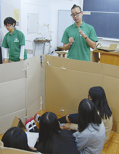 段ボールハウスを体験した2年の男子生徒は「仕切りが高い方がプライバシーが守れて良いな、と思った。今の生活がありがたいと実感した」と感想を話した。
