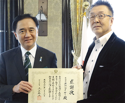 神奈川県内を中心に「美容室イレブンカット」を展開している「(株)エム・ワイ・ケー」(吉楽裕社長、藤沢市藤沢)が昨年11月、県の「かながわ水源の森林づくり」事業へ111万円の寄付を行った。1月20日には、黒岩祐治県知事から同社へ感謝状が贈られた。