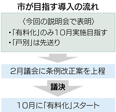 当初、市は7月からの「戸別・有料化」実施を目指していたが、市長選や意見公募などを受け「特に『戸別』に対し様々意見が寄せられた」として、松尾市長は昨年12月議会への条例改正案提出を断念。7月導入は難しい情勢となっていた。