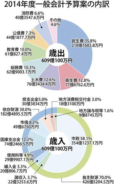 松尾市長が2期目を迎えて初の編成となった2014年度予算。行政運営の基本的経費を計上し、市の予算の中心となる一般会計は609億100万円で、前年度当初予算と比較すると28億1900万円(4・9%)の増となった。