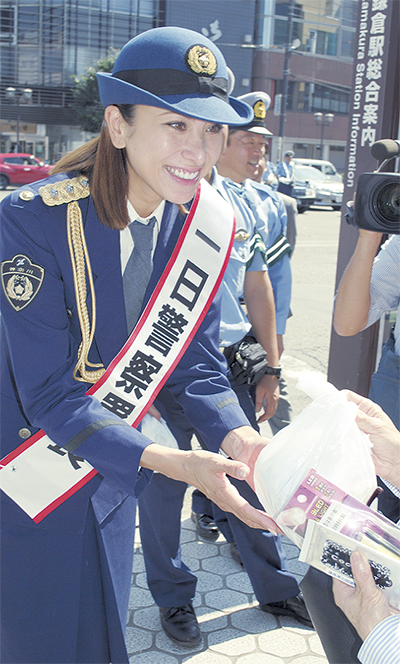 この日はモデル・タレントの道端アンジェリカさんが「一日鎌倉警察署長」に任命された。道端さんは同署内での委嘱式の後、保育園児らの「歩き方教室」や白バイ、パトカーの乗車体験に参加。さらにJR鎌倉駅前に移動し、「交通事故に気を付けて下さい」などと呼びかけながら、観光客らに啓発品を手渡した。