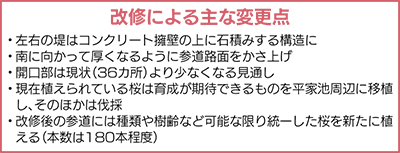 改修により左右の堤をコンクリート擁壁の上に石積みする構造として、積石のたるみや崩落を防止するほか、踏み固めで桜の根を傷めないよう、参道の下に貯留槽と基盤材を埋設する。また試掘調査で発見された土層を保護するため、南側に向かって厚くなるように参道路面の「かさ上げ」を行う。東西への横断が可能な「開口部」に関しては、これまでの36カ所より少なくなる見込みだ。
