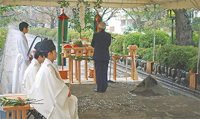 工事に先立ち11月1日、二ノ鳥居前で起工式が行われた。式には松尾崇市長をはじめとする来賓のほか、鶴岡八幡宮の氏子や工事関係者ら約40人が出席。神職が祝詞を奏上し工事の安全を祈願した後、吉田茂穂宮司らが「鍬入れ」を行った。