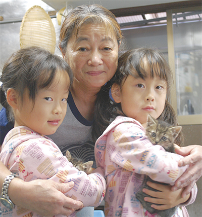 さちこさんから2匹がここに来るまでの一部始終を聞いた関本さんは「2人には、生き物を慈しむ心と愛情を持った人になってほしい」と話し、子猫たちと遊ぶ姉妹を見つめながら目を細めた。