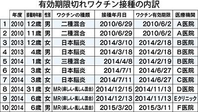 さらに同事業において、有効期限切れのワクチンが投与されていたケースが複数あることが発覚。2010年から14年までの5年間に行われた約14万7千件について確認したところ、10件が判明した(上表)。健康被害等は確認されていないという。