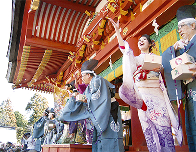 神事の後、3日午後3時40分からゲストや福男・福女らによって豆がまかれる。