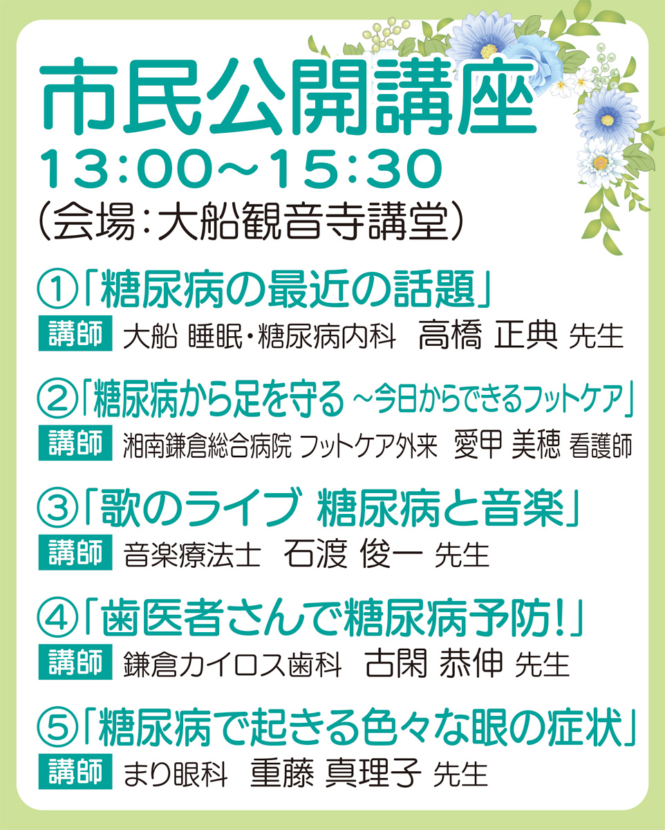 当日は同寺内本堂で糖尿病をテーマにした講演が行われる(表参照)ほか、無料血糖測定(先着200人)や医療相談、栄養相談、鎌倉野菜の即売会などが行われる。時間は午後0時30分から3時30分まで。参加は無料だが同寺の参拝料(大人300円、小中学生100円、幼児無料)が必要。