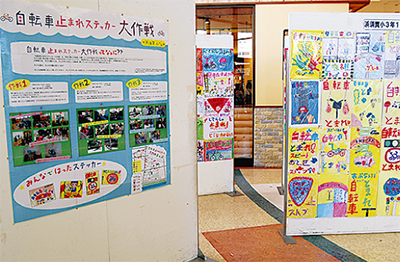 浜須賀小学校3年生らが自転車事故防止を目的として行った「オリジナル『自転車止まれ』ステッカー設置大作戦」。昨年10月からこの事業を進めてきて、このほど同小学校学区の43箇所にステッカーを貼った。