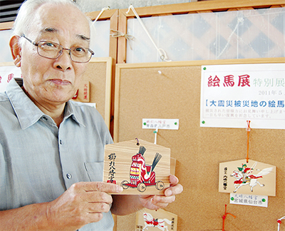 全国各地の絵馬をコレクションにしている堤在住の有光友學(ゆうがく)さん(69歳)が、「大震災被災地」をテーマにした特別展を茅ヶ崎里山公園パークセンター内で開催している。