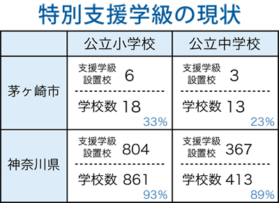 平成22年度「神奈川県学校統計要覧」によると、茅ヶ崎市内の特別支援学級設置校は市立小学校全18校に対し6校(設置率33%)、中学校は全13校に対し3校(同23%)。一方県内全体の設置率は、小学校93%、中学校89%となっている。