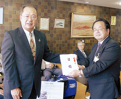 当日は、加藤会長をはじめ8人のメンバーが訪問。発電機1機と一里塚ポケットパーク表示板、汐見台小学校への記念植樹の3つの内容が盛り込まれた目録が加藤会長から服部信明市長に手渡された。