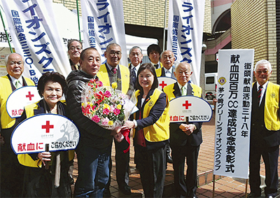 3月19日には400万ミリリットルを達成後、最初に献血を行った後藤金蔵さん(市内松尾在住、65歳)に対し、同クラブが花束と記念品を贈った=写真。井上会長は「毎年行っている街頭活動ですので雨の日もありましたが、根気良く続けてきた結果だと思います。尊い命が救われる活動ですので、これからも続けていきたいですね」と話していた。