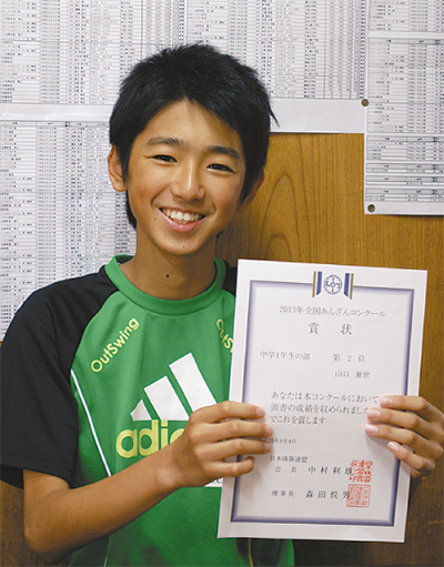 今年6月に行われた「日本珠算連盟創立60周年記念2013年全国あんざんコンクール」の結果が先ごろ発表され、なかよしそろばん塾(市内萩園)の山口兼世さん(中1)が、中学1年生の部で全国2位に入賞した=写真。