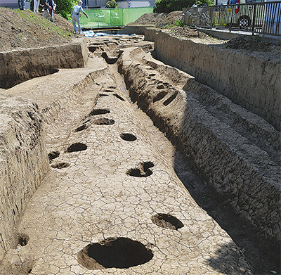 市内矢畑の明王ヶ谷遺跡の調査が進んでいる。今回の第5次調査では、平安時代から江戸時代の生活跡が発見され、鎌倉時代の溝跡からは、幕府がおかれた鎌倉でも数少ないという「刻画文陶器(こくがもんとうき)」も出土した。