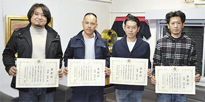 自らの危険を顧みず迅速な判断による初期消火活動や連携プレーで延焼拡大を防いだとして、このほど2組、4人が茅ヶ崎市消防本部で太田登消防長から表彰状が贈られた=写真。