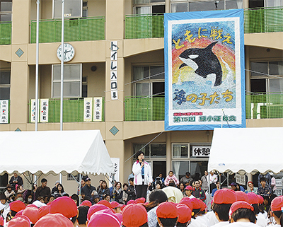 緑が浜小学校(神本直子校長)で10月31日に行われた「第15回緑が浜小学校運動会」に、巨大なシャチの壁画が登場した。