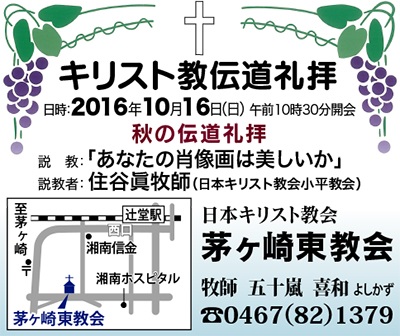 茅ヶ崎東教会(茅ヶ崎市浜竹3の5の58・辻堂駅西口徒歩7分)で10月16日(日)午前10時30分から「秋の伝道礼拝」が開催される。説教は日本キリスト教会小平教会の住谷眞牧師による「あなたの肖像画は美しいか」。申込不要。当日参加可。