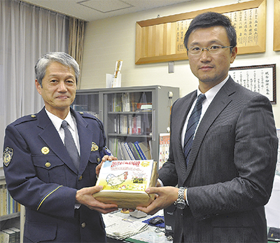 贈呈式で趙組合長は「防犯に役立ててもらえれば。これからも地域の安心・安全に全力で協力していきたい」と話した。倉持署長は「先般も少年補導員連絡会に活動用のベストを寄贈して頂くなど、様々に力になって頂いて感謝している。日頃よく目にするカレンダーが振り込め詐欺や自転車盗難などの注意喚起につながり、管内から1件でも犯罪被害が減ってくれれば」と期待を寄せた。