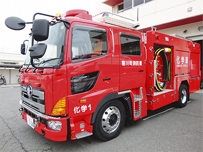 寒川町消防本部に新しい災害対策特殊化学消防ポンプ車が配備された。