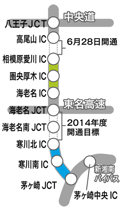 さがみ縦貫道路の高尾山IC(インターチェンジ)〜相模原愛川IC間の14・8Kmが6月28日(土)に開通する。同区間の開通で、東名高速の海老名JCT(ジャンクション)から中央道の八王子JCTを経由し、関越道の鶴ヶ島JCTまでが一本の自動車専用道路で直結。東北道や常磐道など北関東方面へのアクセスが「都心回避」で実現することになった。