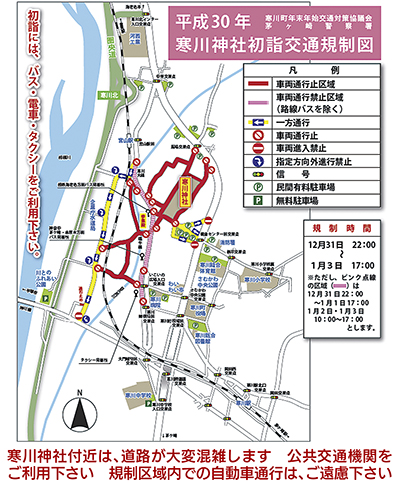 また、12月31日(日)午後10時から2017年1月3日(水)午後5時までは、寒川神社の周辺道路で交通規制が行われる=案内図。毎年、寒川神社には正月三が日だけで約30万人もの初詣客が訪れており、バスや電車などの公共交通機関の利用を呼びかけている。圏央道のさがみ縦貫道路線の交通量も増えたことから、かなりの人出が予想される。