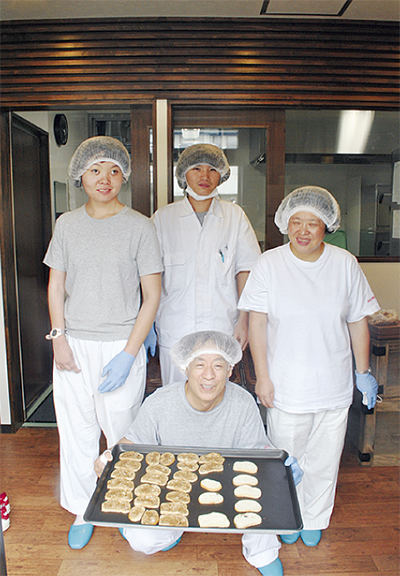 同学園は10年前から、社会就労センター「サンメッセしんわ」の工場でパンやクッキーを製造している。現在は、15人の利用者が1日300〜400個を生産。味はもちろん、季節限定を含めて50種以上という種類の多さも、公共施設や民間企業、イベントなどの販売先で喜ばれているという。