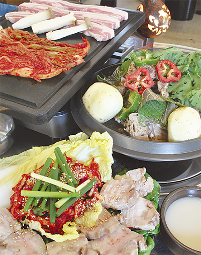 自慢の料理=写真は、薬膳風に蒸した豚肉と辛い漬物を白菜に包んで食す宮廷料理のボッサム(2〜3人前1300円)や、コラーゲン豊富な豚の背骨と野菜の出汁に荏胡麻をたっぷり効かせた韓流鍋のカムジャタン(2〜3人前1500円)。サンギョプサル(980円)は炭を圧縮した本場仕込みの鉄板を傾けて焼くことで、豚バラの肉汁を手前のキムチや野菜にしみ込ませ、肉はさっぱり、野菜はジューシーにいただく。
