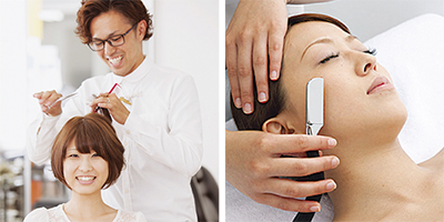 同校は理容学校でありながら、メイクやネイル技術、エステなども学べるトータルビューティースクール。福祉理美容学や英会話にも力を入れており、将来は訪問理美容サロンに就職したり、海外での活躍を目指すなど、卒業後の選択肢も無限に広がる。また、今注目を集めている”お顔そり”のスキルも身につけることができる。年々増えている、エステやブライダル業界への志望者には欠かせないシェービング技術が学べるのは、理容学校ならでは。特に女性の有資格者は、今需要が高まっているお顔そりサロン等にひっぱりだこだ。