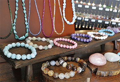 今やパワーストーンとして、女性だけでなく男性からも人気を集めている天然石。店内には、薔薇色に輝くインカローズやカリブ海の美しい宝石ともいわれるラリマーなど色、形様々なものが並ぶ。