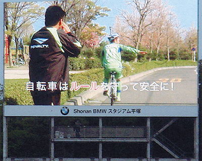 昨年12月に道路交通法が一部改正され、自転車の新ルールが定められたことを周知しようと、市や平塚警察署も協力。映像時間は各15秒で、1本は湘南ベルマーレの曺貴裁監督が選手たちに向かって、自転車のマナーアップを訴える内容。「左側通行を守れ」や「自転車も乗れば車の仲間入り」といったフレーズで注意を喚起している。