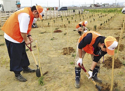 東日本大震災で被災した海岸防災林を再生させるボランティア活動「『みどりのきずな』再生プロジェクト」に6月19日、20日の2日間、グランドホール金目店などを運営する(株)千歳観光から4人が参加した。