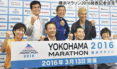 第2回目となる「横浜マラソン2016」の発表記者会見が7月6日、横浜市内で行われた。会見には横浜マラソン組織委員会の山口宏会長をはじめ、1回目に引き続き出走予定の鶴見辰吾さん、石原良純さん、田村亮さん(ロンドンブーツ1号2号)、タレントの福島和可菜さん、また車いす世界記録保持者の土田和歌子さんらが出席し、会見を盛り上げた。