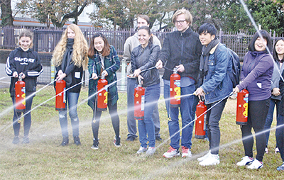 平塚市災害対策課や寮を管理する秀和ビルメンテナンスなどの協力もあり、学生たちは起震車で震度7の揺れを体験したり、消火器の使い方や二次災害の危険性を教わったりした。
