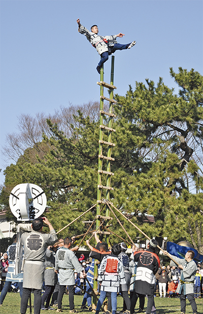 演技の部では、法被姿の平塚古式消防保存会による「はしご乗り」が行われ、竹製のはしごの上で伝統の木遣りに合わせて次々とポーズを決める妙技を実演した(=写真)。