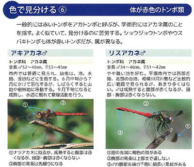 約2年間の調査の集大成となる全47ページ、オールカラーの冊子には、トンボ調査の参加者らが撮影した写真がふんだんに使われている。種類の判断が難しいトンボを「色で見分ける」「形で見分ける」「よく似た種類の見分け方」などの項目で解説している。