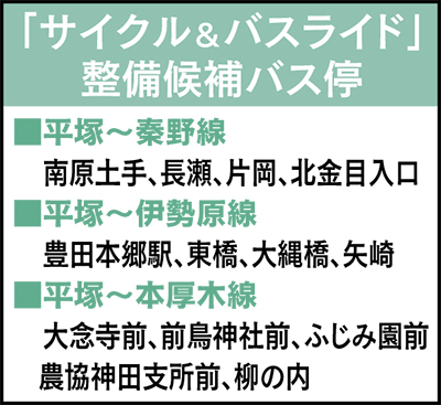 市は、自宅からバス停への移動に自転車を使うサイクル&バスライドの推進や、自転車走行帯の設置、平塚駅周辺の駐輪対策などを盛り込んだ自転車利用環境推進計画素案をまとめた。