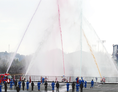 出初式終了後、全分団による一斉放水試験があり、赤や黄色の水柱が冬空に向かって立ち上がった。