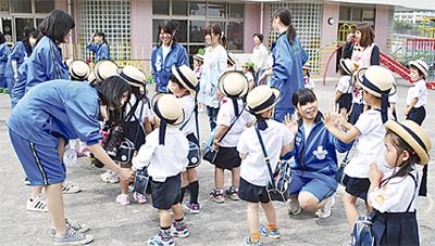 3年生は自由選択科目で保育と子どもの発達について学んでおり、この日の保育実習は授業の一環。将来は保育士や幼稚園・小学校教諭になりたいという生徒が多く、実際に子どもと接しながら幼児教育に関する仕事への理解を深め、自分に適した進路決定につなげていくことも視野に入れている。同幼稚園が高校生の受け入れに協力し、生徒らは5月から訪問を開始。これまでに園内を掃除したり、七夕飾りを作ったりした。