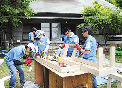 国内外の貧困地域や被災地で住宅建築と修繕活動を展開しているNPO法人ハビタット・フォー・ヒューマニティ・ジャパンのスタッフとゴールドマン・サックス証券の社員合わせて19人がボランティアで参加した。窓枠のニス塗りや障子張り、工具で縁側の床を研磨する作業などを行った。