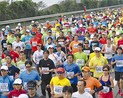 西湘バイパスと国道134号線をコースにした第8回湘南国際マラソンが11月3日にあり、ランナー2万2007人が秋の潮風を浴びて駆けた。10Km車いすを皮切りにハーフマラソンや親子・小学生の部など17種目が行われ、沿道で家族や友人らが参加者を応援。地元住民を中心に3千人を超えるボランティアが大会を支えた。