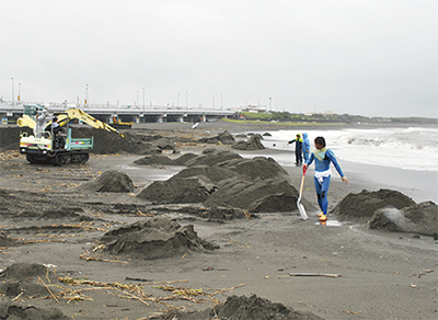 作業2日目となる6月7日、強風で横殴りの雨が打ちつけるなか、同海岸ではサーファーたちが重機を導入して砂浜の整備を続けていた。重機で波打ち際まで集めた砂を海に入れていく地道な作業。「2日間でだいぶ進みました」と、日本サーフィン連盟湘南西支部の柏原亮介支部長は手ごたえを話す。親しんできた海のために、仲間とともに作業は夕方まで続く。「波の影響もあってすぐには結果が出ない部分もある。砂の入り具合を見ながら調整を続けていきます。海の家が建ち始める7月頭までには終わらせたい」と眼差しを海に向ける。