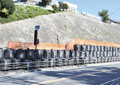 擁壁の異常は17日に道路巡回で確認された。同事務所は翌日から21日にかけて擁壁の下部に大型土のう袋を積んで応急処置を施した。「擁壁を監視しながら、内部に空洞がないかなどを含めて原因を調査し、必要な対策を講じる」という。